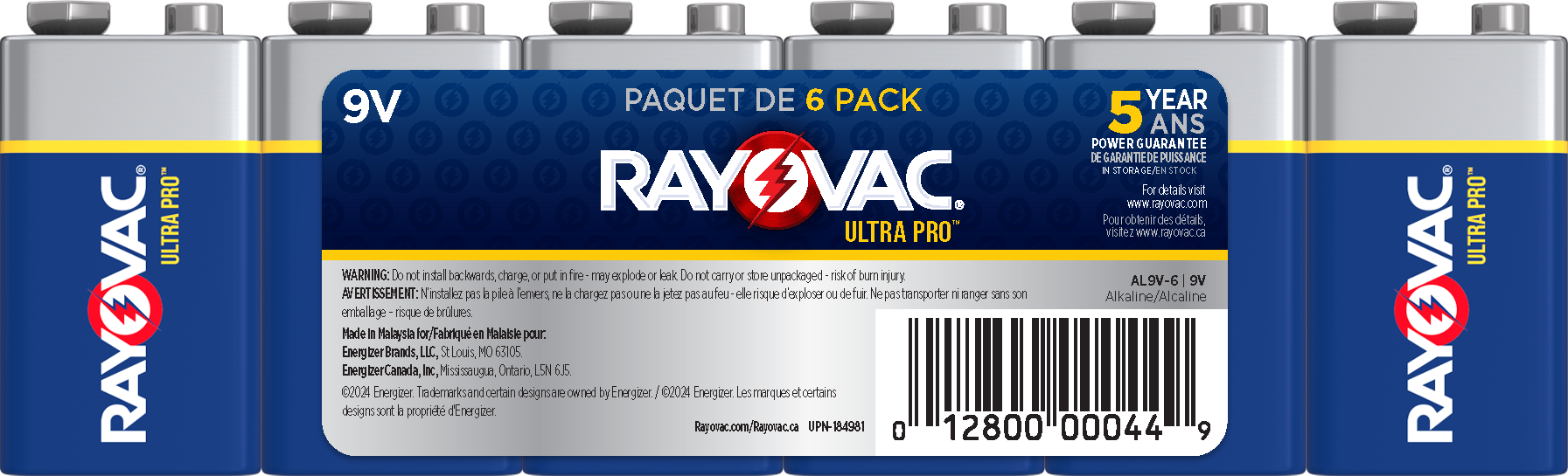 Rayovac Industrial Alkaline 9 volt batteries. 6 batteries per shrink pack.